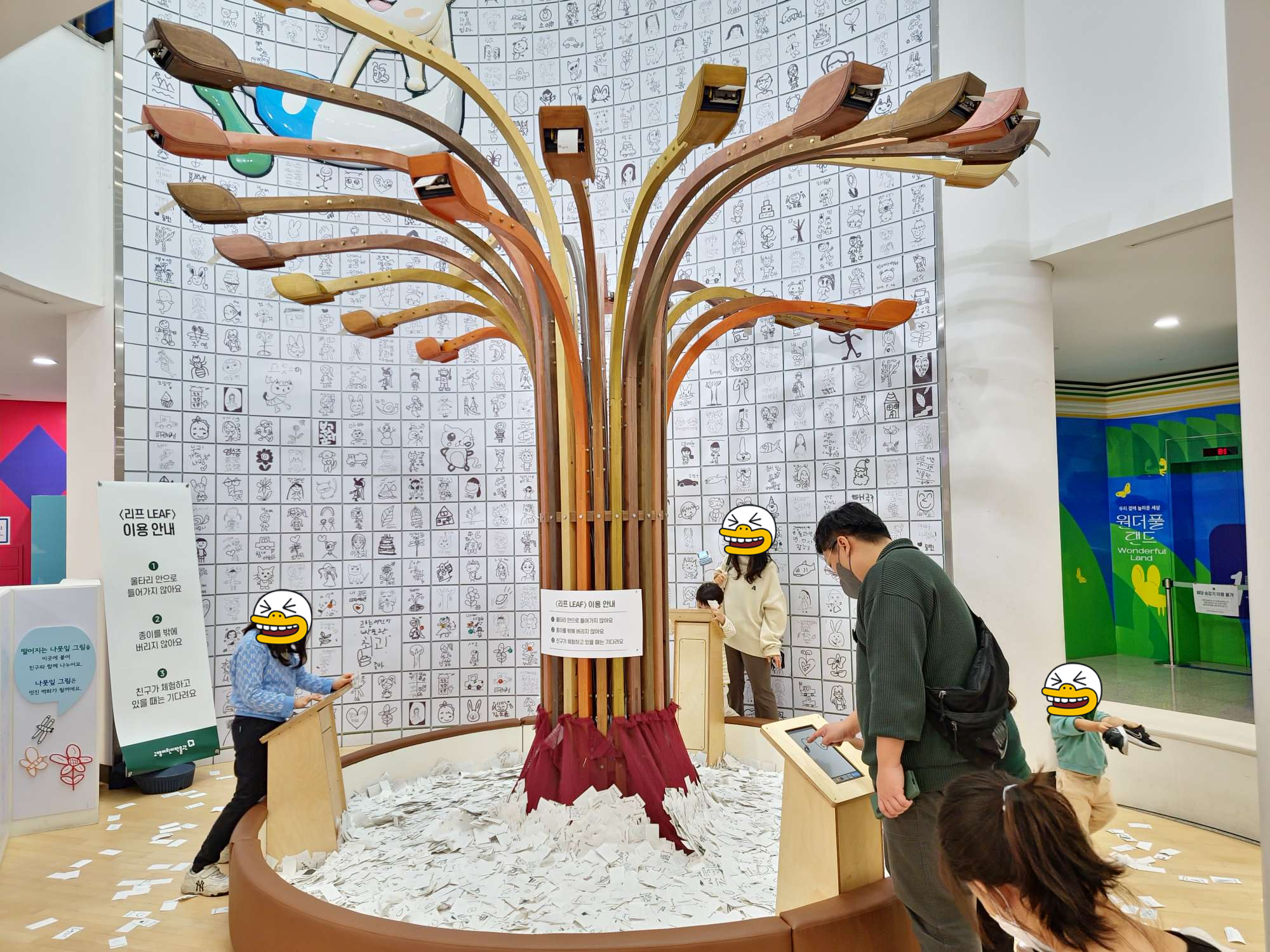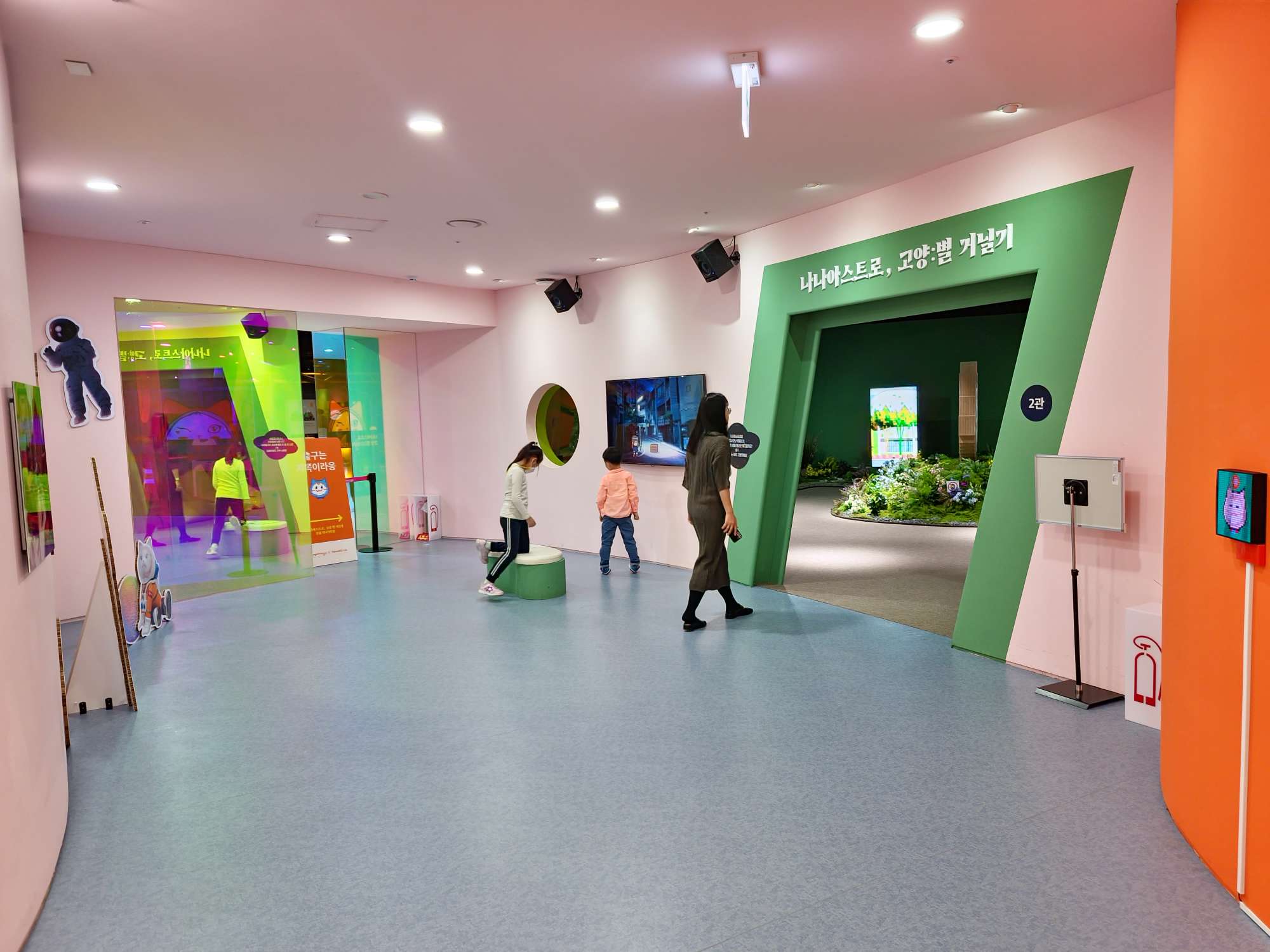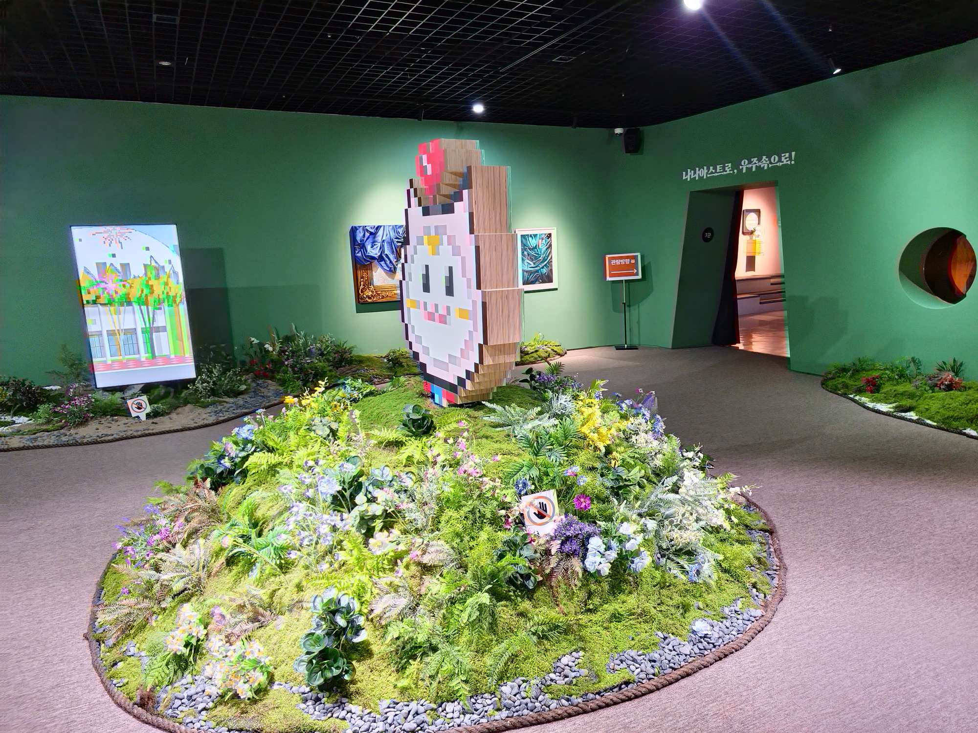 그래픽과 AR로 만든 원더풀랜드입니다. 벽에 걸린 그림은 시간이 지남에 따라 바뀌며 움직이며 바닥에 있는 연못의 물고기는 옆에 준비된 원으로 잡으면 움직이지 않고 잡을 수 있다. 멸종 위기에 처한 동물에 대한 이야기나 습지 생태계 관찰에 관한 이야기 ​​등 어린이와 어른 모두에게 좋은 코너였습니다.