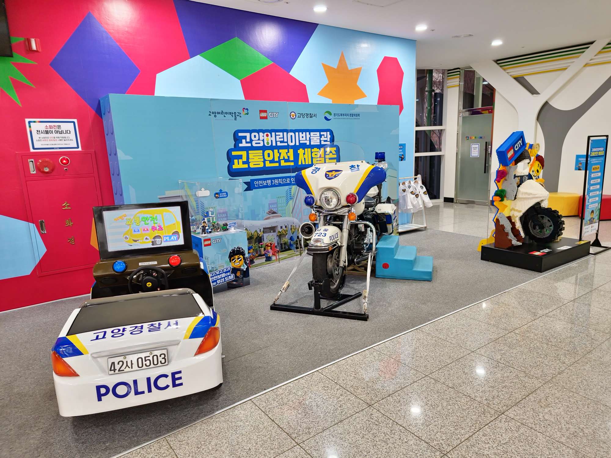 왼쪽은 도로안전퀴즈 OX문제, 가운데는 경찰오토바이 운전체험, 오른쪽은 헬멧 피스에 얼굴을 넣을 수 있는 피스가 있는 포토존인 리얼 레고 작품입니다.