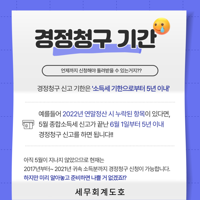 납세의무자가 보정기간 3개월을 경과하여 과다납부한 세액을 다시 돌려받기 위해 신청하는 것으로 신청 가능한 기간은 세금납부기한일로부터 5년 이내입니다. 5년이 경과한 내역은 신청할 수 없고 돌려받을 수 없다는 뜻입니다. 그리고 경정청구는 법정신고 기간 내에 정상적으로 신고를 마친 경우 신청할 수 있습니다.일반적으로 스스로 인지하고 더 많이 낸 돈은 아깝지 않지만 실수로 더 많은 돈을 지불한 경우 더 큰 아쉬움이 남습니다. 경정청구 신청 사항이 발견되는 대로 최대한 빨리 신고해 주시기 바랍니다.