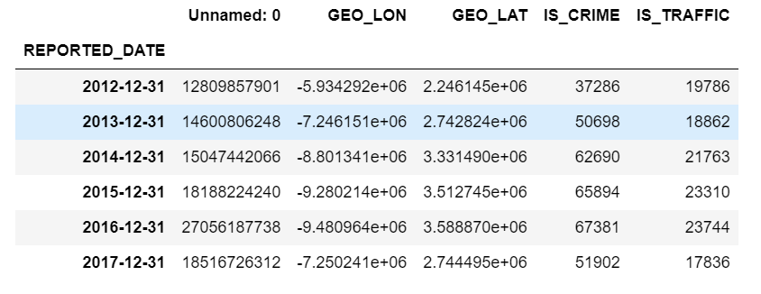 Crime_df = Crime.set_index(‘REPORTED_DATE’)