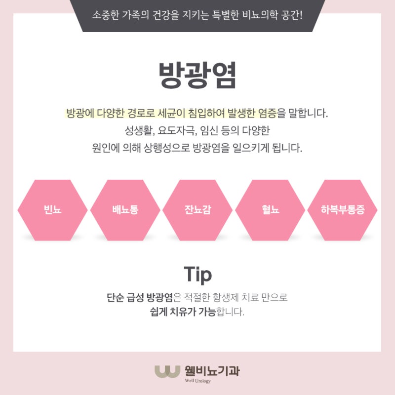 감염의 가장 흔한 경로는 대변에서 회음부 및 요도까지입니다. 장내 세균은 항문을 통해 인접한 질과 요도로 이동합니다. 방광염으로 인한 배뇨 증상은 하루에 8회 정도 강하고 갑작스럽게 소변을 보고 싶은 충동을 느끼는 것입니다. 배뇨 중 통증, 긴급, 배뇨 중 또는 배뇨 후. 방광자극 증상은 드물게 느껴지는 등의 특징이 있으며 해당 증상이 2가지 이상일 경우 빠른 시일 내에 병원에 내원하셔서 비뇨기과의 정확한 검사와 치료를 받으시는 것이 좋습니다.