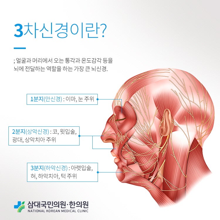 3차 신경통이란 신경에 압박이 가해져 발생하는 질환을 말합니다. 삼차신경은 얼굴의 감각을 담당하는 신경을 뜻하는데 얼굴에 분포한 신경이 세 갈래로 나뉘어 있기 때문에 삼차라고 이름 붙여졌습니다. 1차지는 위로 올라가 이마 쪽 또는 두피 쪽까지 담당하며 2차지는 뺨 쪽, 3차지는 턱에서 귀 앞까지 담당합니다. 사람의 얼굴을 측면에서 봤을 때 세 방향으로 상, 중, 하로 가능 방향으로 생각할 수 있습니다.
