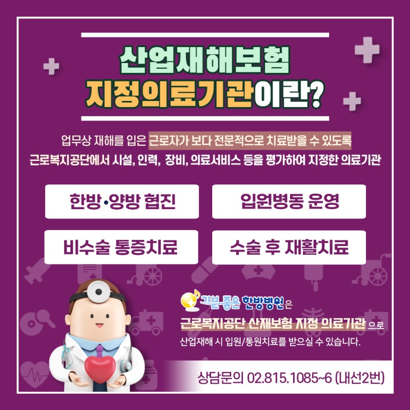 업무 중 다치면 회사에 미칠 영향이 걱정되시나요? 산재보험 가입으로 회사에 지장을 주지 않고, 관절 비용 걱정 없이 쾌적한 한방병원 신대방동 산재지정병원에서 진료받으실 수 있습니다!