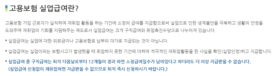 실업급여를 위한 실업급여의 경우 소정의 기준일이 남아 있어도 퇴직한 다음 날부터 12개월이 지나면 자기부담금을 받을 수 없습니다. 그렇기 때문에 퇴직하자마자 지원하는 것이 좋습니다.
