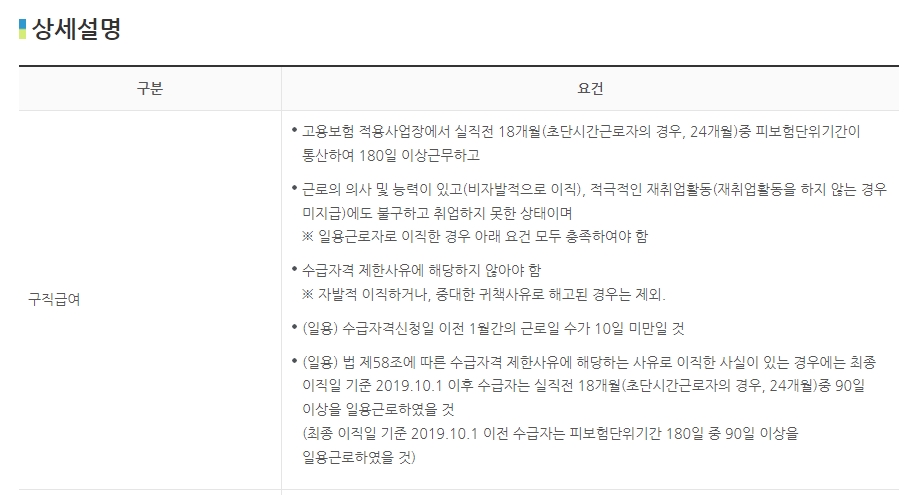 5. 구체적으로 실업 전 18개월, 극단근로자의 경우 24개월 동안 180일 이상 근무하고 일할 의사와 능력이 있고 수급제한 사유에 해당하지 아니할 것.