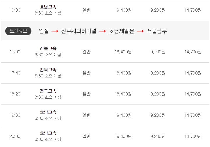 임실에서 서울남부터미널까지 고속버스 시간표, 요금, 예매, 예매