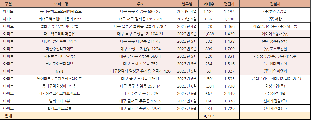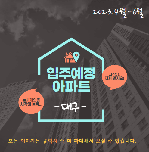 6월 중구 달성파크푸르지오힐스테이트(1,501세대)모으다, 동구 동대구 화성파크드림(1,304세대)입주를 앞두고 있습니다. 그 외 단지는 아래 사진을 참고해주세요. 이미지를 클릭하시면 확대해서 보실 수 있습니다.