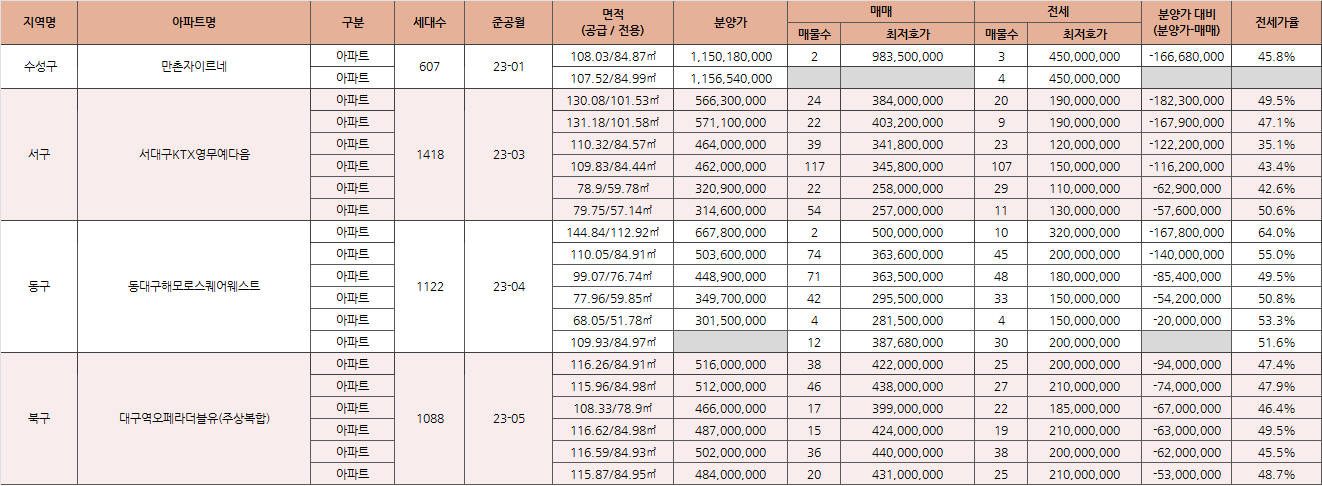 다음 현재 입주 중이거나 2분기 입주 예정인 대구 아파트 단지의 규모(유형)별 매매가격과 오늘 기준 네이버 상장(분양, 전세) 최저가 호가 이것은 인용문입니다. (일반 분양수량이 없는 일부 잔고의 경우 분양가가 공란일 수 있습니다.)