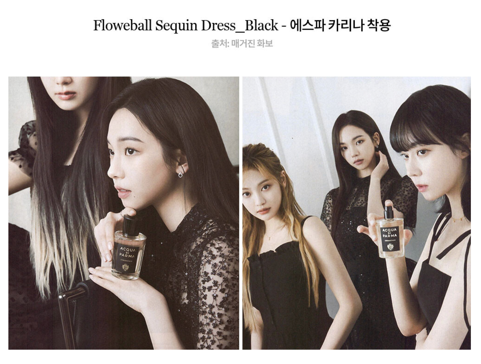 이번에 카리나가 입은 드레스는 걸그룹 에스파의 협찬으로 ‘플라워볼 시퀸 원피스’ 블랙 컬러그것은